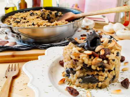 Baixe o fogo, junte o arroz e mexa por 2 minutos. Adicione as passas com metade