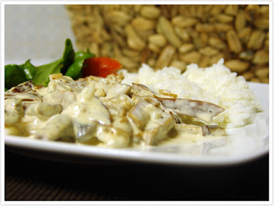 Fazer uma marinada com o vinho branco, o molho de soja, a mostarda, 2 dentes de alho picados, 1 folha de louro e um fio de azeite. Temperar com sal e pimenta. Cortar o seitan em bifes com mais ou menos meio centímetro de espessura e depois cortar em tiras. Envolve-las na marinada e deixar repousar entre 30 minutos a 1 hora. Picar a cebola e os restantes dentes alho e levar a refogar num fio de azeite juntamente com a folha de louro. Deixar cozinhar até a cebola ficar transparente. Acrescentar as tirinhas de seitan de forma a que todas fiquem em contacto com a frigideira. Quando começarem a ficar douradas, retirá-las com a ajuda de uma pinça de salada de forma a que fique na frigideira só a cebola e o alho. Cozinhar os cogumelos (previamente laminados) na frigideira entre 5 a 8 minutos. Acrescentar o molho da marinada, deixar evaporar um pouco e juntar as tiras de seitan. Acrescentar as natas, envolvendo-as no seitan e cogumelos. Verificar os temperos e deixar ferver. Está pronto! Eu gosto de servir com arroz branco e uma salada.