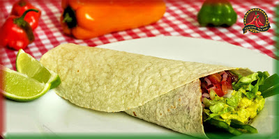 Tortillas de trigo com recheio de guacamole, pimentões, salsa e carnitas de glúten aceboladas