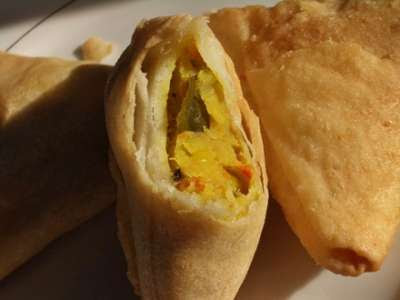 Misture as farinhas, a margarina e o sal. Aos poucos adicione cerca de 1/2 xícara de água morna. Amasse até obter uma massa homogénea. Reserve. Prepare o recheio. Aqueça uma panela, adicione o azeite e coloque a mostarda. Quando começar a pipocar acrescente o gengibre. Frite rapidamente e adicione o açafrão, o coentro moído e o cominho. Junte a batata e misture. Tampe a panela e cozinhe, em fogo baixo, por 3 minutos. Tempere com sal e adicione o coentro fresco picado, deixe esfriar. Sobre uma superfície lisa polvilhada com farinha de trigo, abra a massa em círculos de uns 12 cm de diâmetro. Corte cada rodela ao meio e com cada pedaço forme um cone. Coloque um pouco de recheio preparado e feche bem. Para fechar bem os pastéis, humedeça os bordos de massa com água fria. Deixe sobre um pano humedecido.