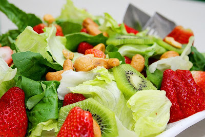 Para a salada, folhas de alface, rúcula, morango, kiwi, castanha de caju(pode usar outro fruto seco).