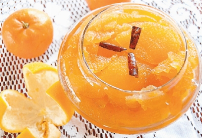 Cozinhe as cascas em pouca água até amolecerem. Retire do fogo, escorra, reserve a água e deixe esfriar. Bata as cascas e a água no liquidificador, passe por uma peneira grossa. Junte o açúcar e leve novamente ao fogo com os cravos e a canela, mexendo sempre, até desprender do fundo da panela.